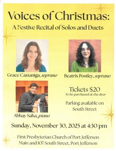 Please join us on Sunday, November 30th at 4:30pm at 107 South/Main Street in the heart of Port Jefferson Village for Voices of Christmas: A Festive Recital of Solos and Duets with Grace Cazzaniga, Soprano, Beatrix Postley, Soprano and Abhay Saha, Pianist.
